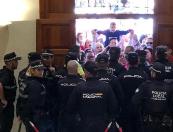 Thirty National and Local Police officers block group from entering the Vélez-Málaga town hall where a council meeting was in progress: The parents of the more than 550 pupils of the José Luis Villar Palasí primary school in Vélez-Málaga, known as ‘Zona Norte’, gathered outside the town hall on Monday 14 November in protest against last week’s decision by the Junta de Andalucía to close the school, after a series of cracks that have been present in the buildings for almost four decades had worsened. More than 200 people gathered to demand “a solution” to the decision to relocate the children to three other schools in the town, arguing that it would disrupt family and work routines. They also demanded a solution to the building. Photo: E. Cabezas. Full article: https://www.surinenglish.com/malaga/axarquia/school-protest-20221115115323-nt.html
