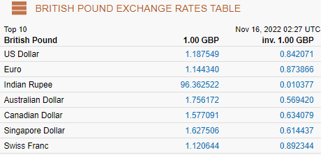 – The pound was last up 1.2% against the dollar at $1.1902, having reached a session high earlier of $1.2027, while against the euro sterling rose 0.7% to 87.26 pence. Full article: https://www.reuters.com/markets/currencies/sterling-hits-highest-almost-3-months-ahead-uk-budget-dollar-tumbles-2022-11-15/