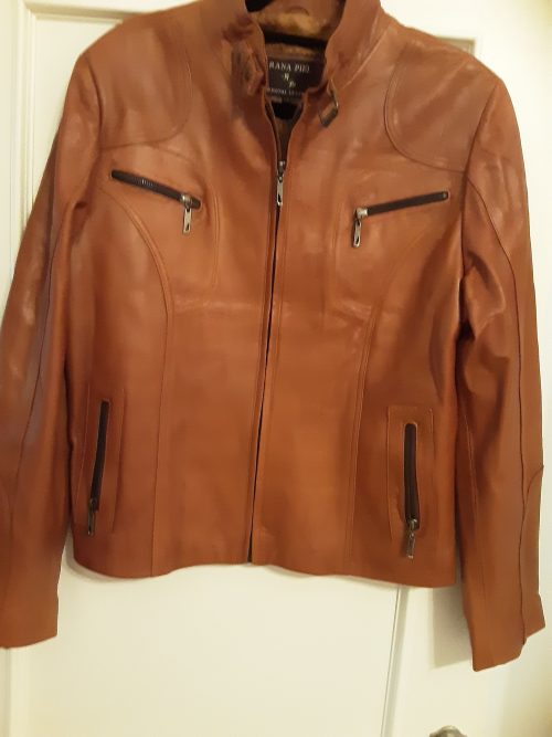 For Sale: Tan leather jacket, size 14, never worn so still new cost 150 euros but will accept 50 euros. Irene, Nerja