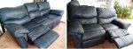 – 3 seater and 2 seater navy leather recliner suite. Extremely comfortable. Overall good condition. Slight scuffing on 2 of the arms. 4 seats recline. 185€.