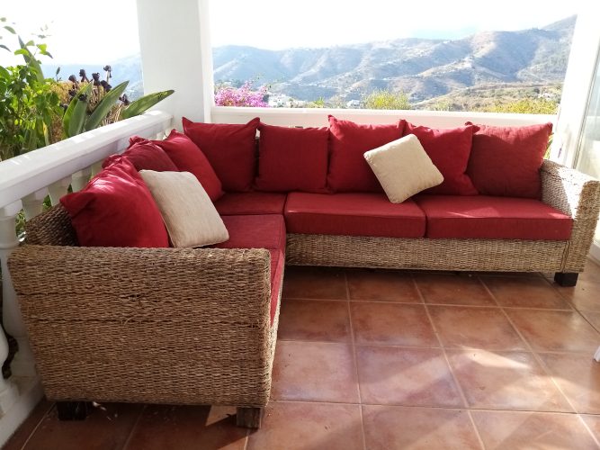 – Outdoor lounge suite. Purchased from Dunnes a few years ago. Very comfortable. Slight damage to raffia hence the price.