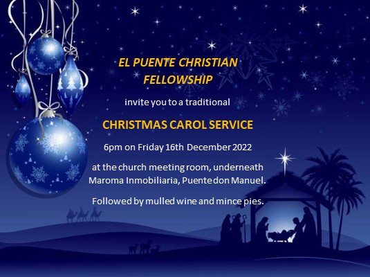 6pm on Friday 16th December, at the church meeting room, underneath Maroma Inmobiliaria, Puente don Manuel.