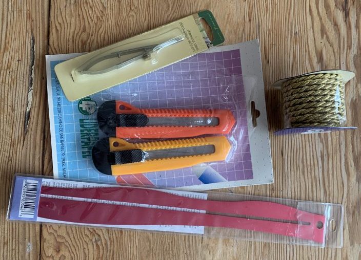 – Craft Bundle consisting 2 unused safety craft knives, one pair new stainless steel decoupage scissors, one unused papercraft ruler to mark for centering, measuring and alignment and to make wave effects either at the edges or part of your design, and one reel of gold effect craft rope (not sure of the length but there seems to be a good amount) 7 Euros for the bundle.
