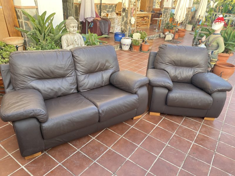 – Chocolate brown leather 2 seater sofa with matching chair very comfy Measurements 175 x 90cms 113 x 90cms Price 160€