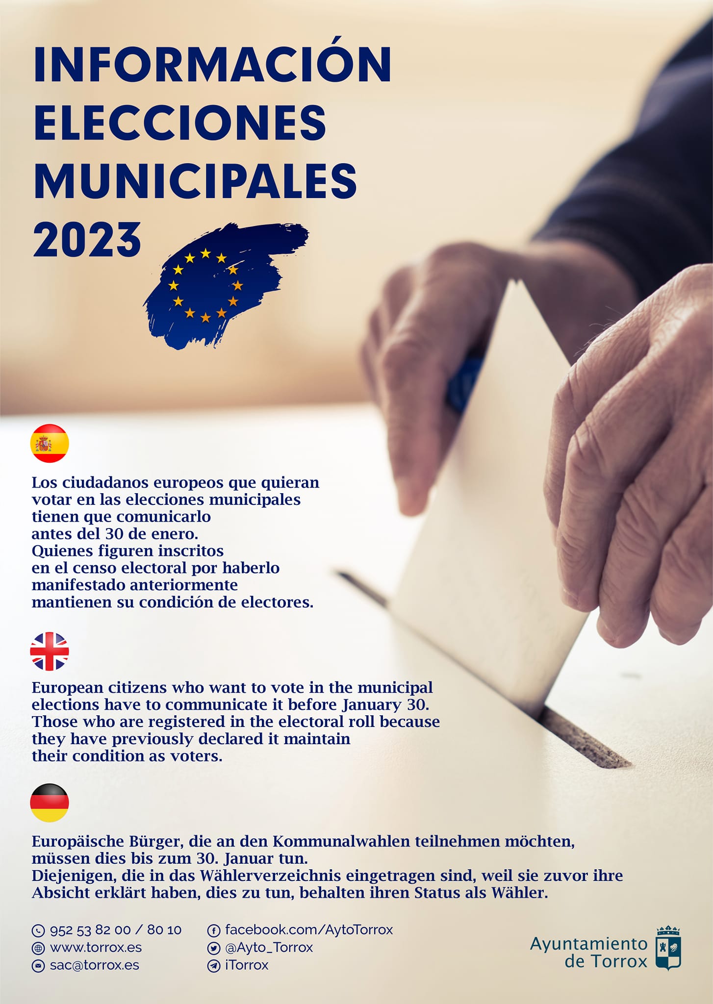 Message from Ayuntamiento de Torrox: European citizens who want to vote in the municipal elections have to communicate it before January 30. Those who are registered in the electoral roll because they have previously declared it maintain their condition as voters. FB