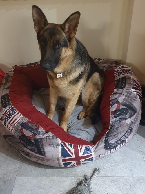 For Sale: Dog bed. New KNUFFELWUFF 80cm x 80 cm dog bed. High sided, soft, big separate inside cushion, luxurious, a reluctant sale, it’s too small for my GSD pup! The photo will give you a laugh.