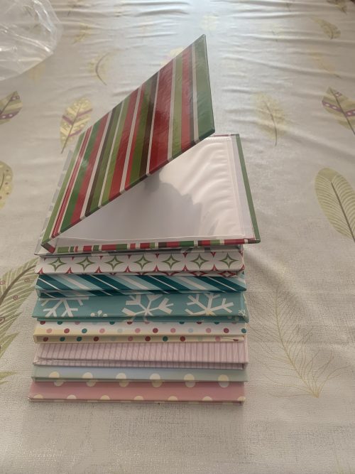 – Small scrap books, 9 scrap books size 17cm (6.75″) x 18cm (7″) with 10 plastic sleeves inside each one. Variety of colours as seen in the photo. They have never been used but a couple of them have very slight discoloration along the edge. 17 Euros for all of them. Would possibly separate.
