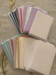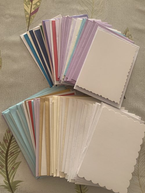 – 40 blank cards with envelopes. Suitable for crafters. Size is standard A6, card 4″ x 6″. Several colours, some with matching envelopes and some with white. Cards around 250 gsm envelopes around 100 gsm. 10 Euros