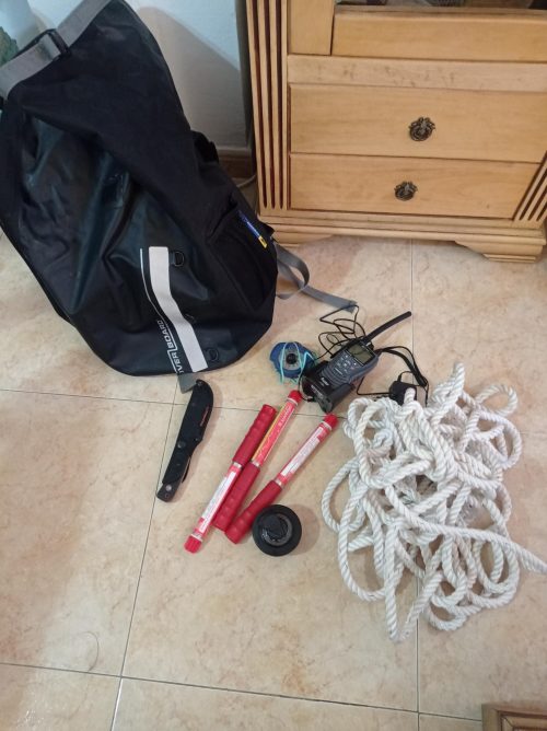 (Details here.), 3 Flares, Compasses, Marine knife, Marine rope. €100