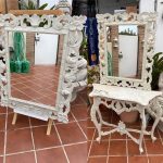 – Table & Mirror. Ornate decorative wooden console table with matching mirror. Beige mirror With Marble top