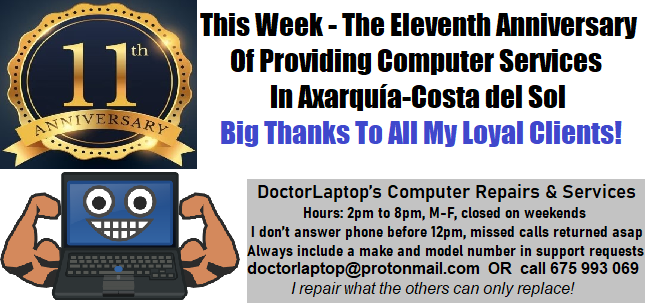 DoctorLaptop’s Computer Repairs & Services: Protect your computer & your privacy with annual servicing. The Doctor is closed on weekends. Always include the make and model number of the device when making support requests. DoctorLaptop’s Website & Contact Info: doctorlaptop@protonmail.com or call 675993069 after 12pm, missed calls returned asap. Located in Torrox Costa near the bus station. Note: I do not work on devices more than 8 years old unless they have been receiving annual servicing by me. My contact details are shown every day in the Sponsor’s Section.