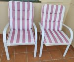 For Sale: 2 terrace chairs constructed in white painted aluminium. Complete with cushions and stackable. €20 for the pair. Location Caleta de Velez. Contact Buyer collects. Adrian/Annie on 608811828 mobile or WhatsApp or Email lamplighters1152 at outlook dot com