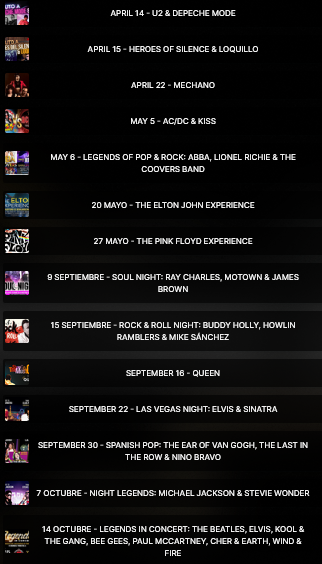 – 14 October – Legends In Concert: The Beatles, Elvis, Kool & The Gang, Bee Gees, Paul McCartney, Cher & Earth, Wind & Fire