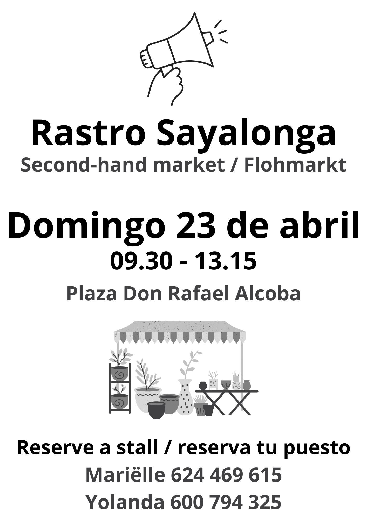On Sunday the 23rd of April, Sayalonga will have its first Rastro / Second hand market. It will be held on the main square, Plaza Don Rafael Alcoba, from 09:15am – 13:15pm. Half of the stalls are now reserved. To reserve a stall, please contact Marielle on (+34) 624 469 615 or Yolanda (+34) 600 794 325 (both also on WhatsApp). Price for a stall is 5 Euros.