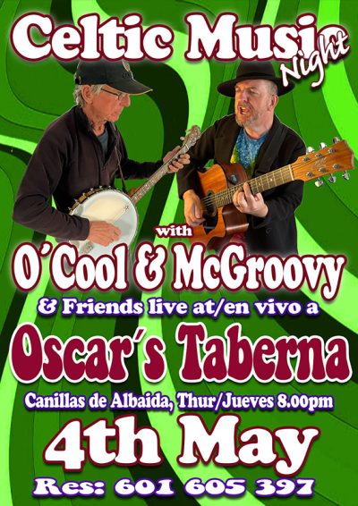 Celtic Music Night with O´Cool & McGroovy: Oscars Taberna in Canillas de Albaida, Thursday May 4th from 8.00pm. Come and join us for a night of live Celtic Music. Guest singers, players, dancers etc very welcome, all in the Celtic tradition. To reserve your table call 601 605 397.