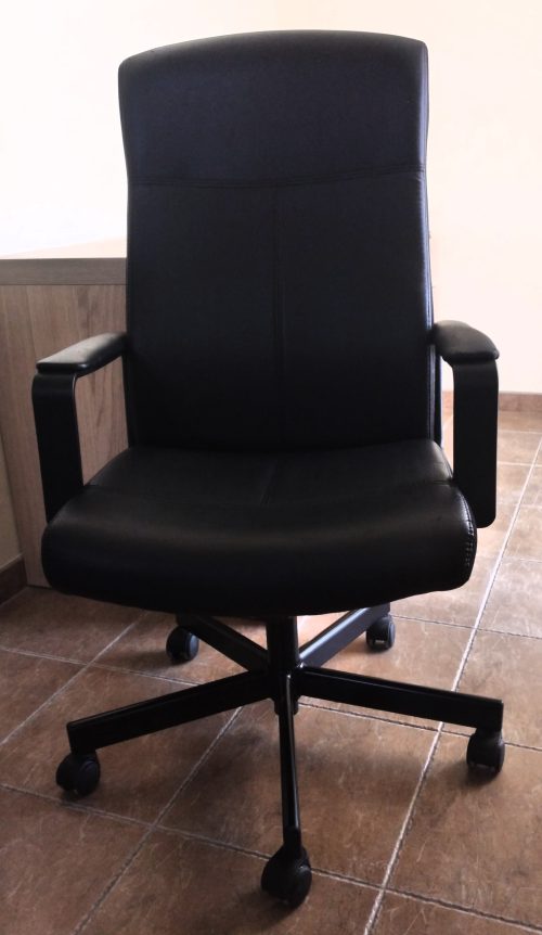 – IKEA Millberget swivel chair in black. Measurements are Depth 70cm. Max Height 128cm. Seat width 52cm. Seat depth 45cm. Unfortunately an over zealous kitten used the chair to climb up so there are some superficial scratches on the chair. Could easily be covered. However, in full working order and still plenty of life left in it. €25