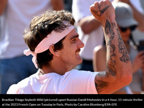 – Brazilian qualifier Thiago Seyboth Wild {pic} scored one of the biggest upsets in recent French Open memory, knocking out No. 2 Daniil Medvedev in the first round of the Grand Slam event with a thrilling five-set win Tuesday in Paris. Seyboth Wild, the No. 172 player in the world, and his Russian foe each converted seven break points in the 4-hour, 15-minute match at Roland Garros. The 23-year-old Brazilian totaled two aces, six double faults and 69 winners in Tuesday’s 7-6(5), 6-7(6), 2-6, 6-3, 6-4 win. Medvedev logged 14 aces, 15 double faults and fired 45 winners. He also totaled 60 forced errors compared to Seyboth Wild’s 51. Seyboth Wild will meet No. 88 Quentin Halys of France or No. 423 Guido Pella of Argentina in the second round.