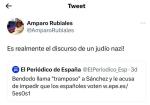 – The honorary president of the PSOE of Seville, Amparo Rubiales, has launched an anti-Semitic insult against the number three of the Popular Party, Elías Bendodo from Malaga, whom she has accused on Twitter of being a “Nazi Jew”.