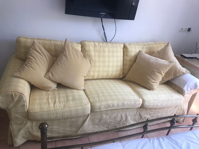– Three seat IKEA sofa from 300 to 125 Euros, add 4 cushions at 5 Euros each.