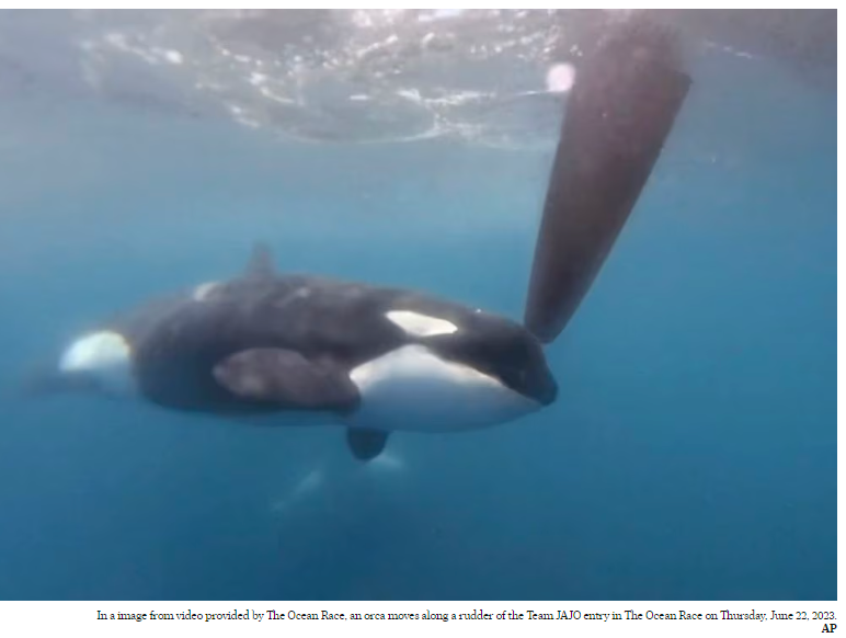 More Orca Attacks On Boats In Spain- Orcas disrupt boat race near Spain in latest display of dangerous, puzzling behavior: The 15-minute run-in with at least three of the giant mammals forced the crew competing in The Ocean Race on Thursday to drop its sails and raise a clatter in an attempt to scare the approaching orcas off. No one was injured, but Team JAJO skipper Jelmer van Beek said in a video posted on The Ocean Race website that it was “a scary moment.” “Twenty minutes ago, we got hit by some orcas,” he said in the video. “Three orcas came straight at us and started hitting the rudders. Impressive to see the orcas, beautiful animals, but also a dangerous moment for us as a team.” Full article: https://english.elpais.com/international/2023-06-24/orcas-disrupt-boat-race-near-spain-in-latest-display-of-dangerous-puzzling-behavior.html & Video Link