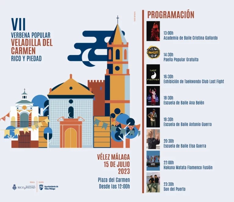 – The show ‘Hakuna Matata Flamenco Fusion’ will take to the stage at 22.00 hours and the flamenco group ‘Son del Puerto’ will close this edition of the Veladilla with their musical performance at 23.30 hours. Source, Spanish: https://www.axarquiaplus.es/la-vii-veladilla-del-carmen-rememora-este-proximo-sabado-las-tradiciones-y-el-flamenco-de-la-mano-de-la-archicofradia-del-rico-y-la-piedad-en-velez-malaga/