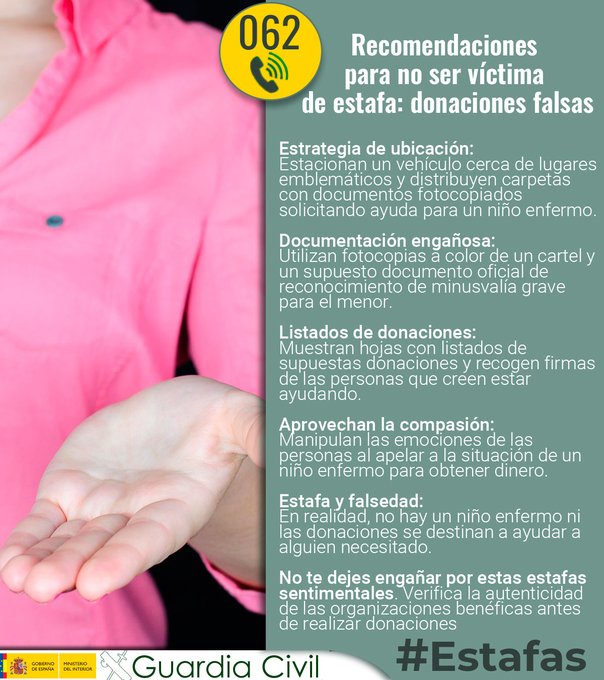 – To avoid falling for this type of scam, the Guardia Civil urges people to try to verify the existence and authenticity of charities before making donations. They also recommend calling 062 if a scam of this type is detected or suffered. Source, Spanish: https://www.20minutos.es/noticia/5148204/0/guardia-civil-lanza-un-aviso-sobre-popular-timo-las-donaciones-como-funciona-esta-estafa/