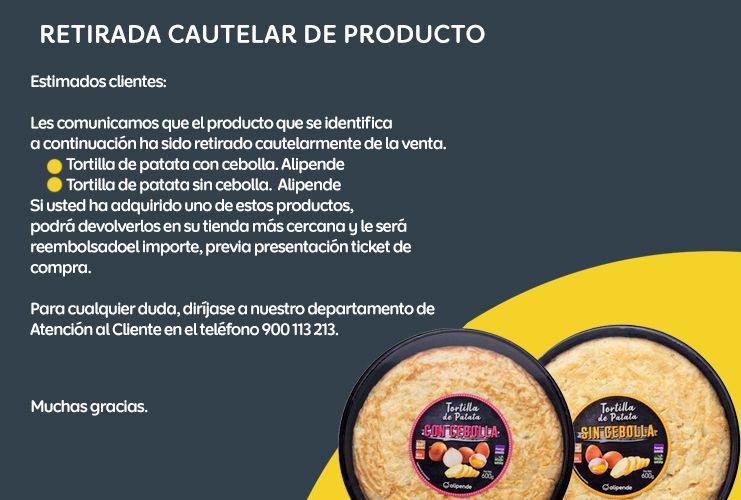 – The supermarket chain Ahorramas has published a statement on its website announcing the withdrawal, for health reasons, of Alipende potato omelettes (including those of the white label Palacios), with and without onion. The reasons for this recall are still unknown.