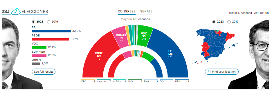 – Alberto Núñez Feijóo (PP) has won the elections of 23 July, but without a sufficient majority to oust Pedro Sánchez from La Moncloa (official residence and workplace of the Prime Minister). With 97% of the vote counted, the PP is fourteen seats ahead of the PSOE (136 to 122), which suggests, with all due caution, that Sánchez will continue to lead the government thanks to the votes of Sumar (31 seats) and the required investiture support of his pro-independence (Catalan) partners.