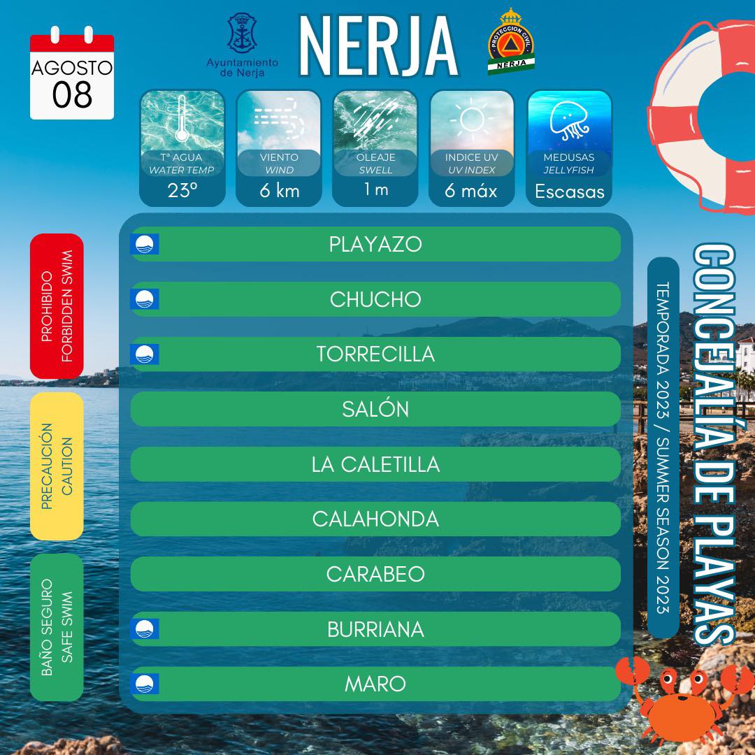 Nerja Beach Report Aug 8th: The Ayuntamiento de Nerja posts these in the afternoon of the day reported on. These will always be one day behind.