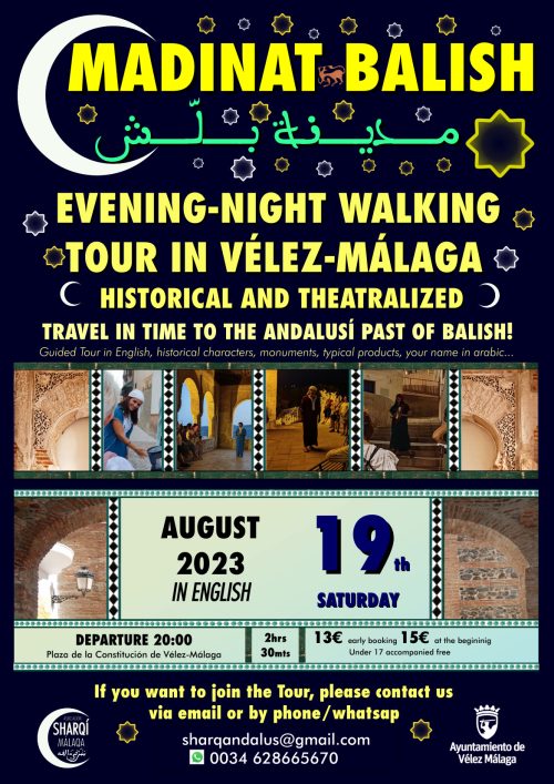 Vélez-Málaga. Saturday August 19 at 8:00 p.m. Departure from: Plaza de la Constitución (next to the El Pósito building and the San Juan church). Price: 13 euros with advance reservation / 15 euros at the beginning. 2.5 hrs.