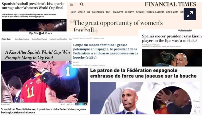 – The only other story making headlines is the silly controversy over Spanish football federation (RFEF) president Luis Rubiales (male) giving a split-second kiss on the lips to a 33 year old player in spontaneous celebration as the Spanish team won their World Cup championship match. It’s probably the biggest event in both their lives, but the celebratory kiss is what the press focuses on, and calls it “an assault”? Sorry, a momentary kiss indiscretion, in an instant of joy after a huge victory, in a country where double kiss greeting people you barely know is common, this is not a news worthy “assault”. Yet many are making this out to be a serious offence. For example, Yolanda Díaz, leader of Sumar and acting vice president of the Government has called for the resignation of Rubiales for the kiss to Jenni Hermoso: “He has harassed and assaulted a woman”. Although the player indicated “she did not like it,” the “victim” deemed his actions a “natural gesture of affection”. News outlets with this “assault” as a front-page story {pic} should be ashamed of themselves. So I’m gonna pass on covering that also.