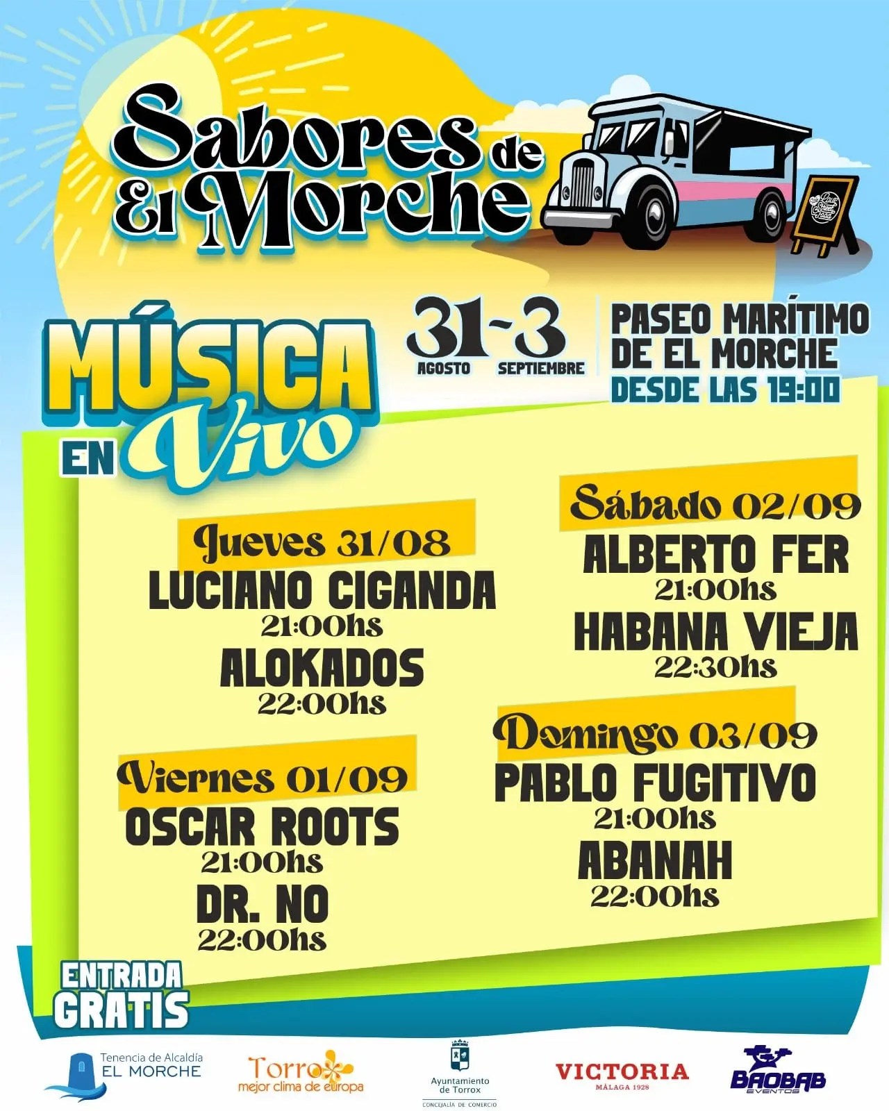 El Morche Foodtrucks: From August 31 to September 3, on the town’s Paseo Marítimo. Admission is free and you can visit them from 7:00 p.m. every day. There will be two daily performances with live music for all tastes, a children’s area and eight different trucks offering to enjoy, as well as a bar area with tables and chairs. The eight food trucks will serve German sausage; pad thai and noodles; fried chicken, salads, sandwiches and nuggets; Argentine empanadas; arepas, tequeños and cachapas; tacos, enchiladas and nachos; beef, chicken and vegetarian burgers; and waffles, crepes and coffee.