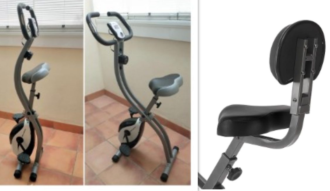 Battery-operated LCD display (functions: time, calories, speed, distance, heart rate). Magnetic resistance, 8 resistance levels. Folding mechanism. Hand pulse sensors. Maximum user weight: 110 kg