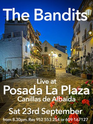 The Bandits play live at Posada La Plaza. Fantastic setting in Canillas de Albaida, if Steven Spielberg designed a set depicting a beautiful Andalucian village square it could not be more idyllic than this! Come and dance the night away with us. To book your table (and a room at La Posada situated right in La Plaza if your are coming from afar) call 952 553 254 or 609 167 127.