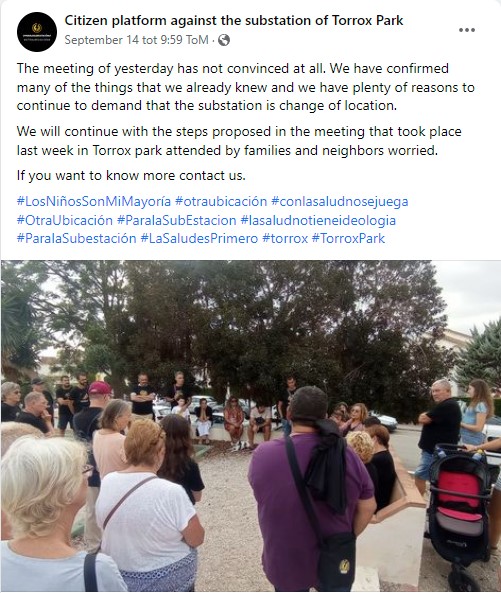 Protest against Endesa’s electricity substation next to several educational centres in Torrox: {Translation, summary}