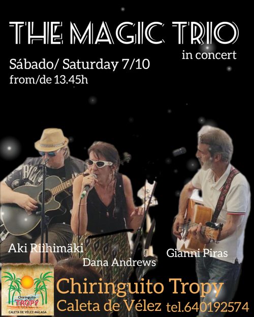 – On Sat, 7 Oct, 1:45pm The Magic Trio will play at the chiringuito Tropy Caleta de Vélez. Info and reservations: +34 640 19 25 74