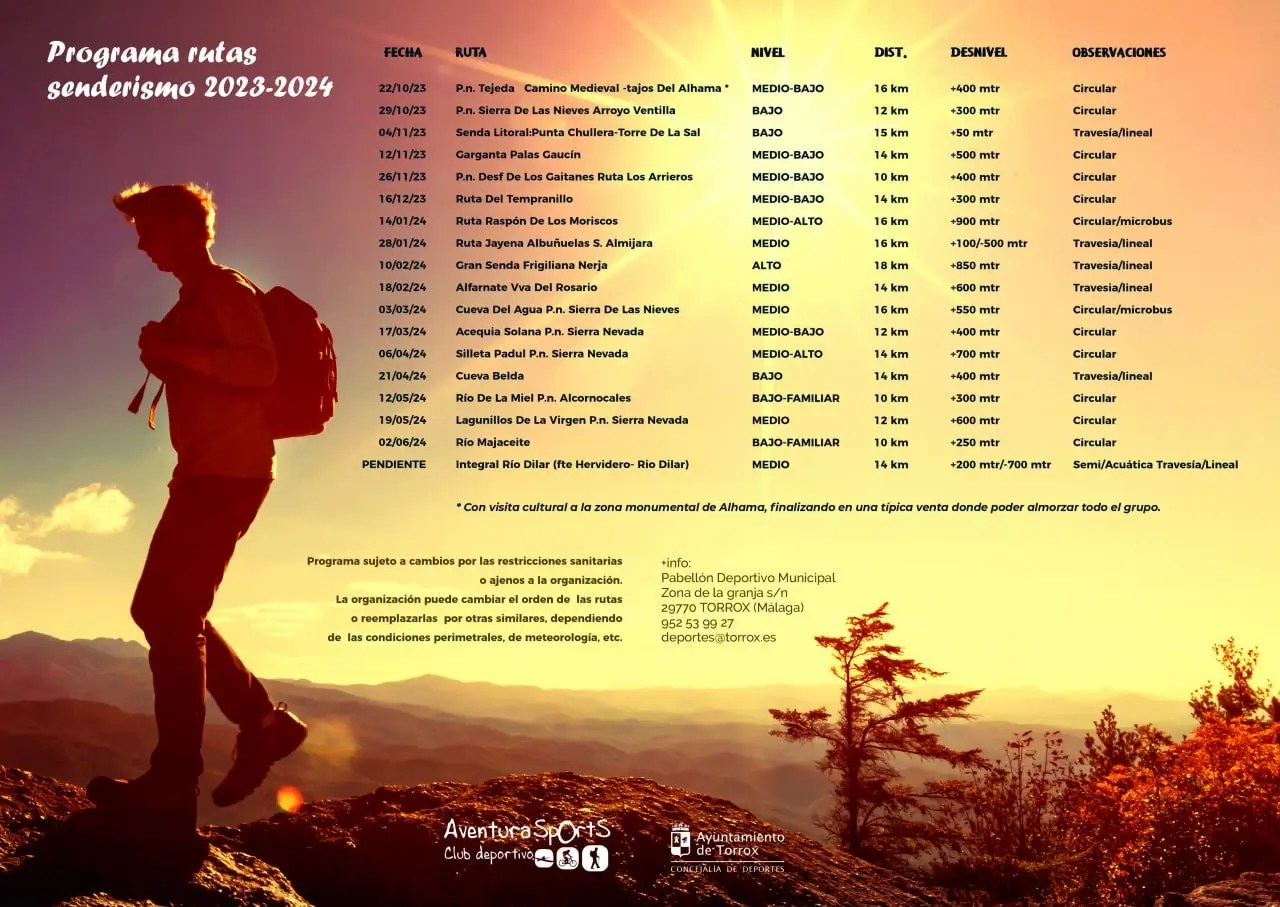 – The Sports Delegation of the Torrox Town Hall has presented 18 new hiking routes for the 2023-2024 season, which are organised together with the Club Deportivo Aventura Sport. The inscriptions are already open at the price of only ten euros, including bus, insurance and guide. “We encourage all lovers of hiking in our municipality to participate in these routes, many of which are designed to be enjoyed by the whole family,” said the Sports Councillor.