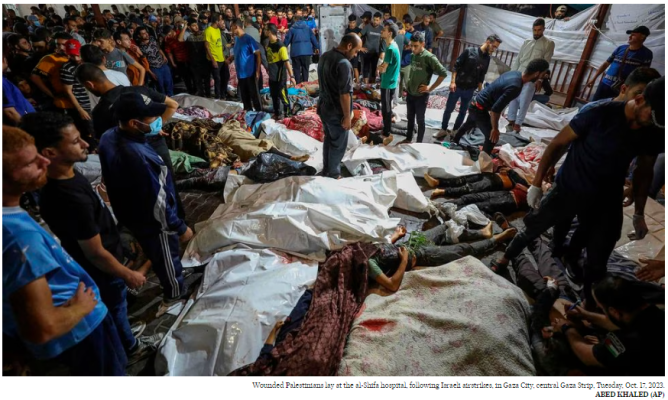 New bombing hits Gaza hospital, killing hundreds, as Israel and Palestinians blame each other for the rocket: Hamas blamed an Israeli airstrike, while the Israeli military said the hospital was hit by a rocket fired by Palestinian militants. The Palestinian health ministry said at least 500 people had been killed. Full article: https://english.elpais.com/international/2023-10-17/israeli-airstrike-hits-gaza-hospital-killing-500-palestinian-health-ministry-says.html