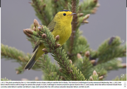 – Birds that will be renamed include those currently called Wilson’s warbler and Wilson’s snipe, both named after the 19th century naturalist Alexander Wilson. Audubon’s shearwater, a seabird named for John James Audubon, also will get a new name. In 2020, the organization renamed a bird once referring to a Confederate Army general, John P. McCown, as the thick-billed longspur. Full article: https://apnews.com/article/bird-renaming-american-ornithological-society-aee0f0b0d1cc9ae3326bc44a2d1f55e8