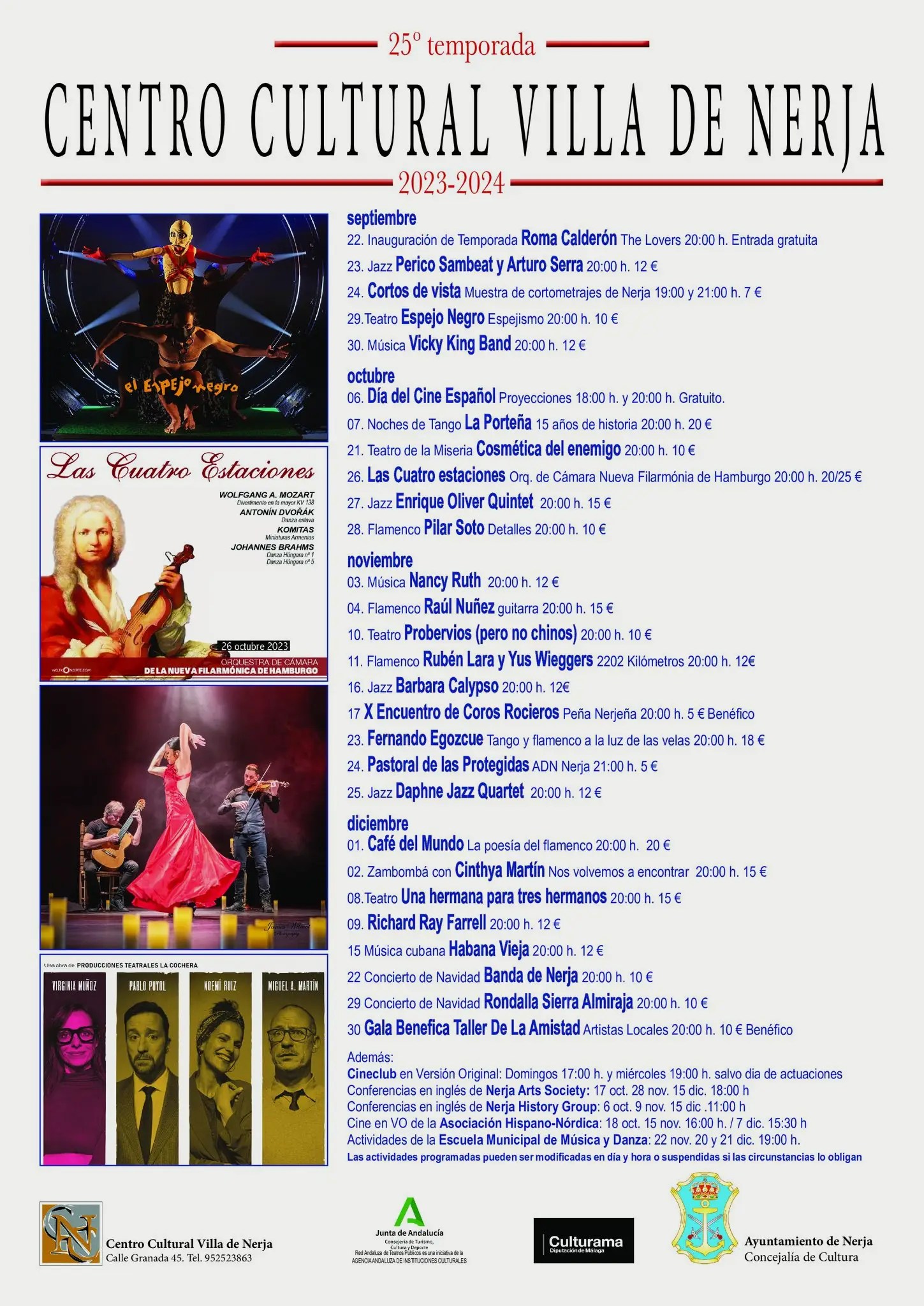 – Full schedule of events remaining at the Villa de Nerja Cultural Centre in 2023 in poster, click to enlarge.