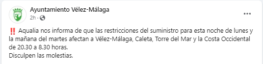 Water Cuts extended in Vélez-Málaga, Caleta, Torre del Mar and the Western Coast: Aqualia informs us that the supply restrictions for this Monday night and Tuesday morning affect Vélez-Málaga, Caleta, Torre del Mar and the Western Coast from 8:30 p.m. to 8:30 a.m. Sorry for the inconvenience.