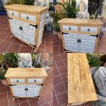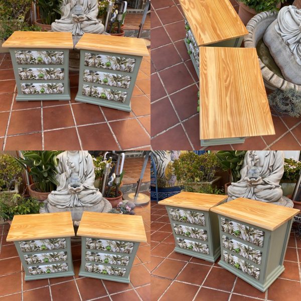 – Matching bedside tables Natural wood top (finished in danish oil) Olive green Decoupage drawer fronts New green pumpkin handles Measurements 50 x 35 x 54cms Price 110€