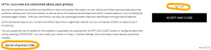 – If you click to see the list of partners, you will see a long list of companies you never heard of and the purposes of the cookies each partner admits to. Some will say “Legitimate Interest”. That is straight up BS. Strangers, who you have never contacted, nor intend to, have absolutely no legit interest in what websites you visit or searches you do. In fact, none of the supposed uses of your data by “partners” are really legit, unless you have contacted them first.