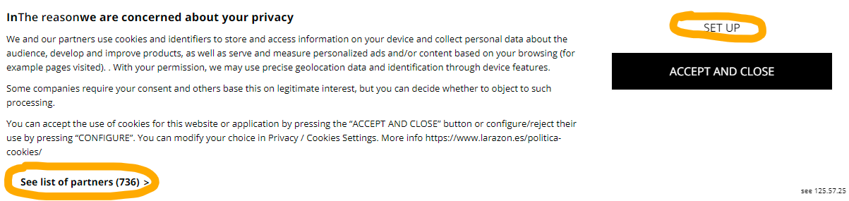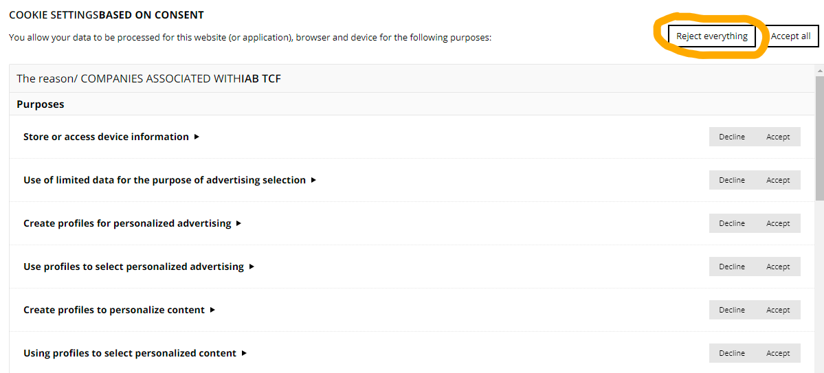 – What you can do when you encounter this cookie permission popup, is NOT click “Accept”, instead click the other button, usually named “Set Up” or “View Partners”. Somewhere on the list of partners you will usually find the “Reject All” button, click that, then click “Save”, and proceed to the website. In cases where there is no option to “Reject All”, you may have to un-check all the partner trackers individually, and then click “Save Choices” to achieve the same “Reject All” effect.