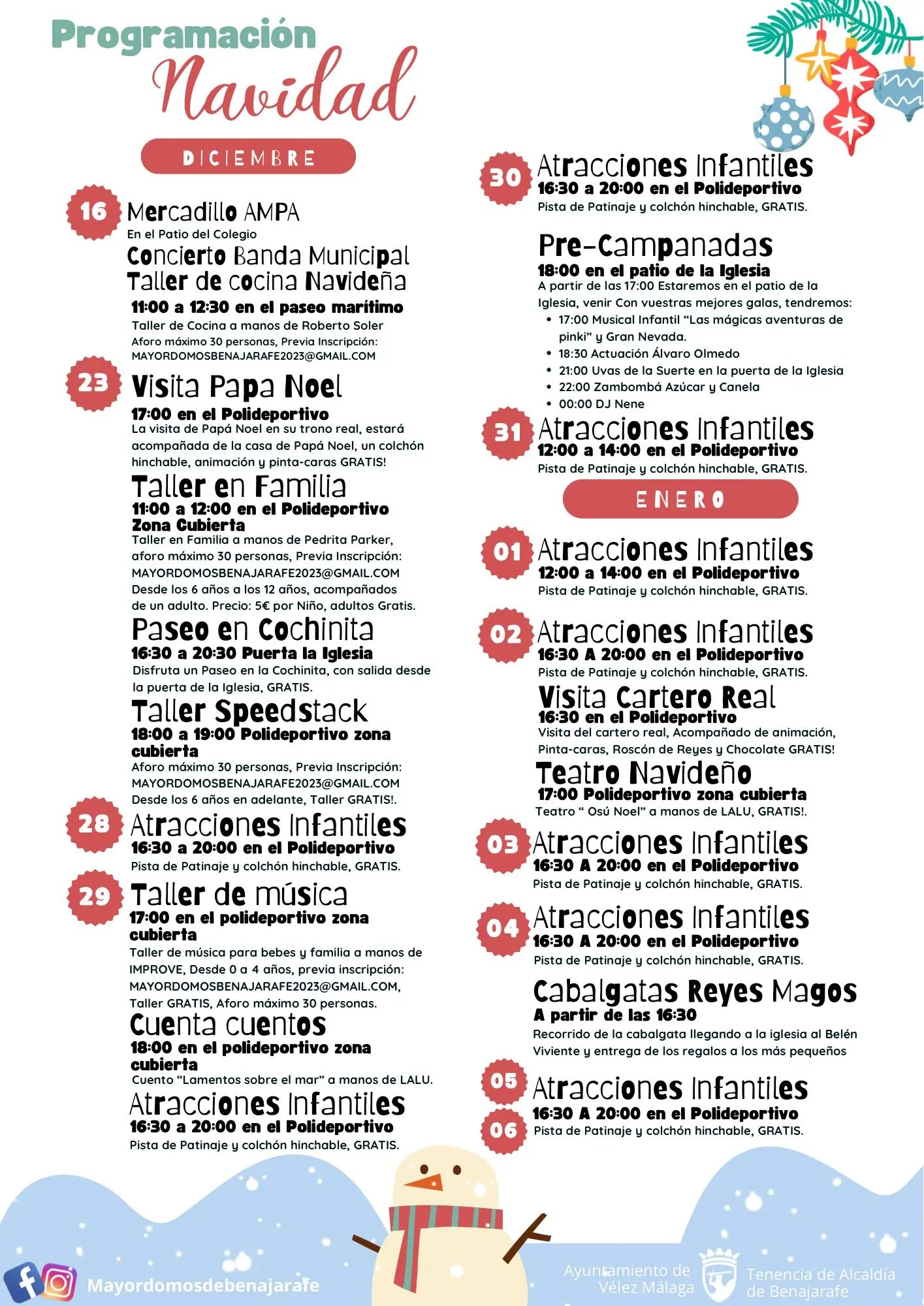 – “We will have a pre-bell ringing in the church courtyard, story-telling and Christmas theatre. And in the final stretch of Christmas, on the afternoon of the 2nd we will receive a visit from the Royal Postman, while on the 4th we will have the Three Wise Men’s Parade, which will arrive at the Living Nativity Scene in the Church and where gifts will be given to the small, a day earlier than usual,” concluded Marcos Vigo. Source, Spanish: https://www.axarquiaplus.es/benajarafe-celebrara-una-navidad-plena-repleta-de-actividades-y-una-pista-de-patinaje/