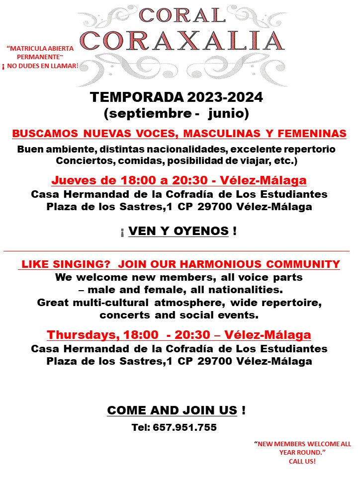 Coraxalia multi-national Choir welcomes new singers. We rehearse on Thursdays, 18:00 – 20:30 in the Casa Hermandad de la Cofradía de los Estudiantes, Plaza de los Sastres, 1, CP 29700 Vélez-Málaga, near San Juan Church and the Language School. Parking nearby at the San Francisco market (1 euro). For more information please contact 657 951 755 (English) or 653 150 058 (Spanish). Email: mariordan@aol.com. Please note that you may join Coraxalia at any point in the Term time. Don’t hesitate to give us a call!