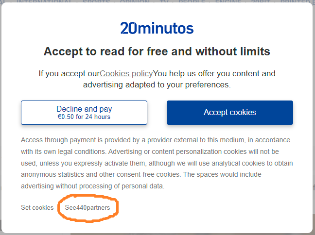 – New EU data laws are being implemented with the start of the new year. What you will notice quickly are the new style “accept cookies to view website” popups. These cookie permission popup have been around for a couple of years, but the new ones provide more info and options. To proceed you must accept them using cookies, or give them something of value to decline the cookies. These will often offer the option to subscribe to decline cookies. The subscription may cost a few euros per month, or in some cases just giving them your email address will suffice. These notices are supposed to display the number of the website’s “partners” they share the info collected from cookies with. The example below, from the 20minutos Spanish news website shows that it shares your data with 440 partners! See the orange circle in the photo below. That is just one of the hundreds of websites I visit daily. If you wonder where spam and targeted advertising comes from, this explains much of it.