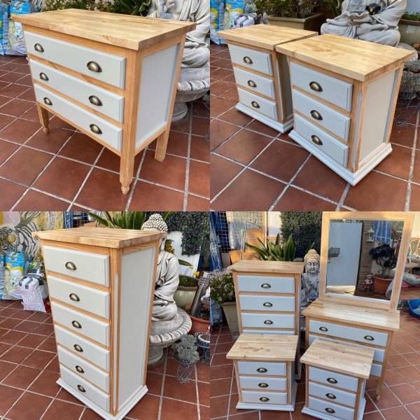 – Matching bedroom set Consists of Mirror 74 x 86cms. 60€ Chest of drawers 80 x 40 x 76cms 145€ Tallboy 60 x 40 x 112cms 145€ 2 bedside tables 50 x 35 x 55cms 130€ Price 475€ (for the set)