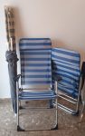 For Sale: Beach furniture. Two beach chairs/loungers, beach umbrella and large wind break. Bargain price 30 euros the lot.