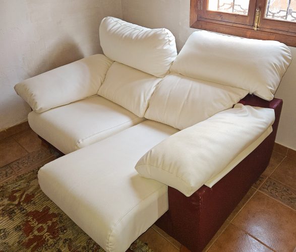 – 2 seater sofa in cream and burgundy imitation leather. Fully adjustable backrests and base cushions. 200€